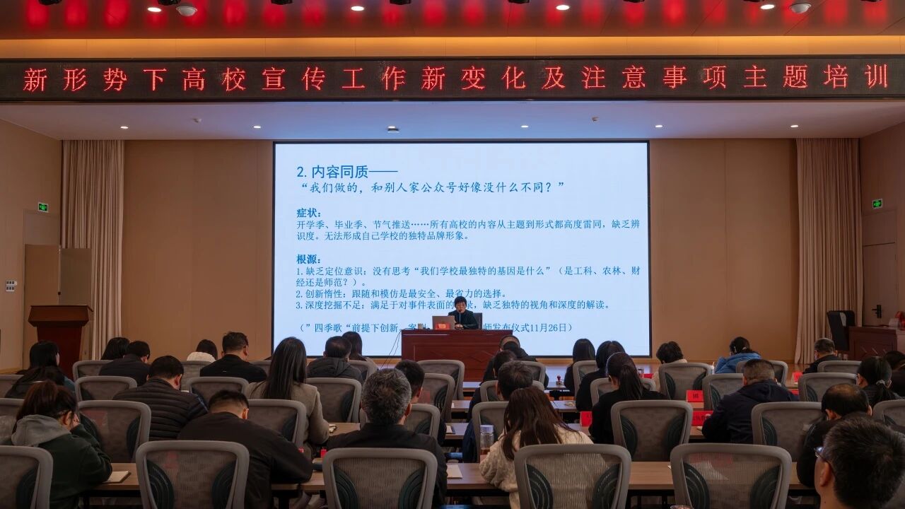杨晓谜深耕教育新闻宣传与舆情管理领域,经验丰富。培训中,她结合当下教育领域的最新动态和实际案例,深入剖析了新形势下高校宣传工作所面临的新变化,从传播渠道的多元化到受众需求的个性化,从舆情环境的复杂化到宣传策略的创新化,进行了全面且细致的讲解,并详细阐述了在实际工作中需要注意的关键事项,为参训人员提供了宝贵的指导和建议。